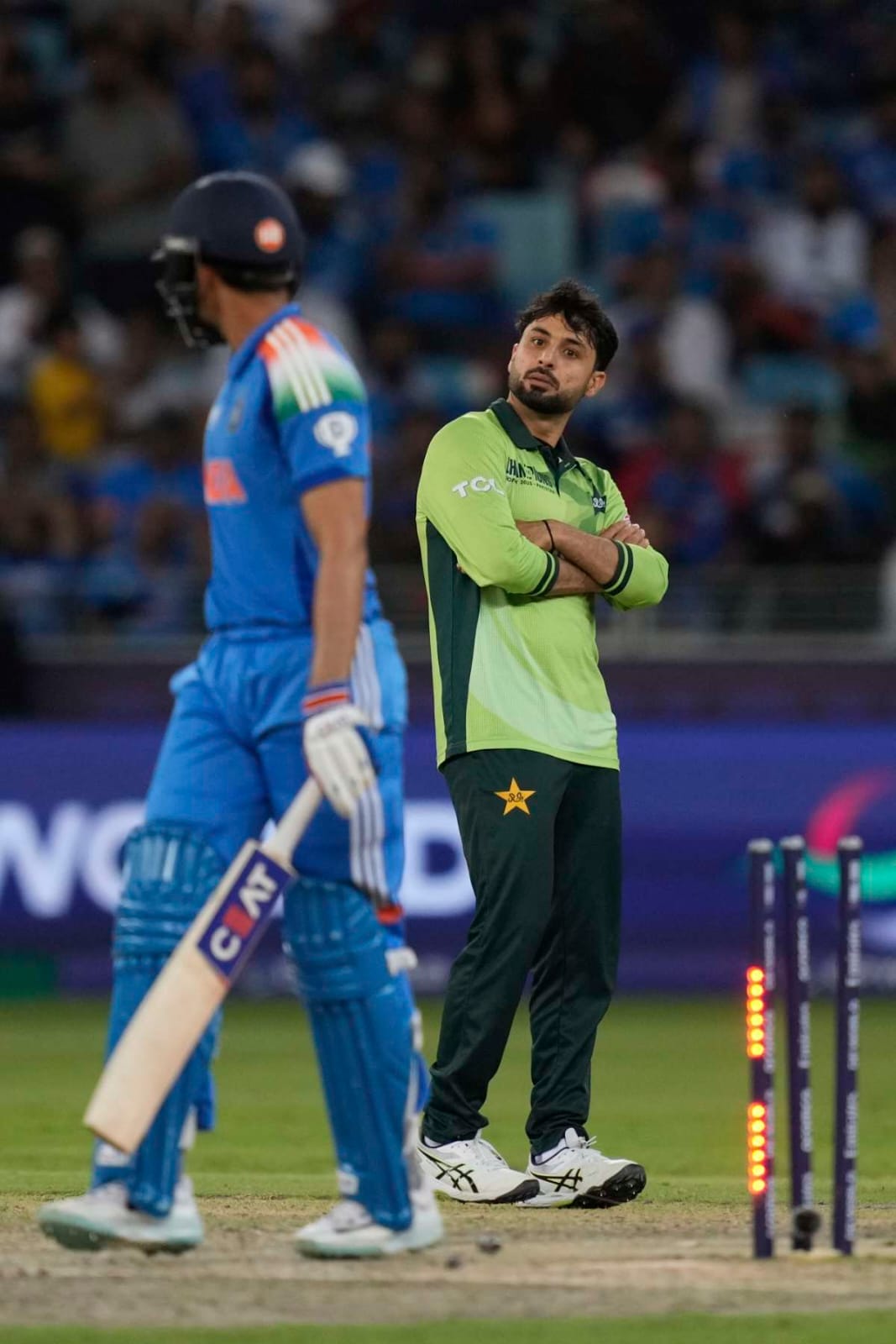 উইকেট নেওয়ার পর তারিকের উদ্যাপন মুহূর্তে ভাইরাল। পাশাপাশি অবধারিতভাবে স্মরণে আসছে ২০২৫ আইসিসি চ্যাম্পিয়ন্স ট্রফির (ICC Champions Trophy 2025) অনুষঙ্গ। শুভমান গিলকে আউট করে বিতর্কে জড়িয়েছিলেন আবরার।