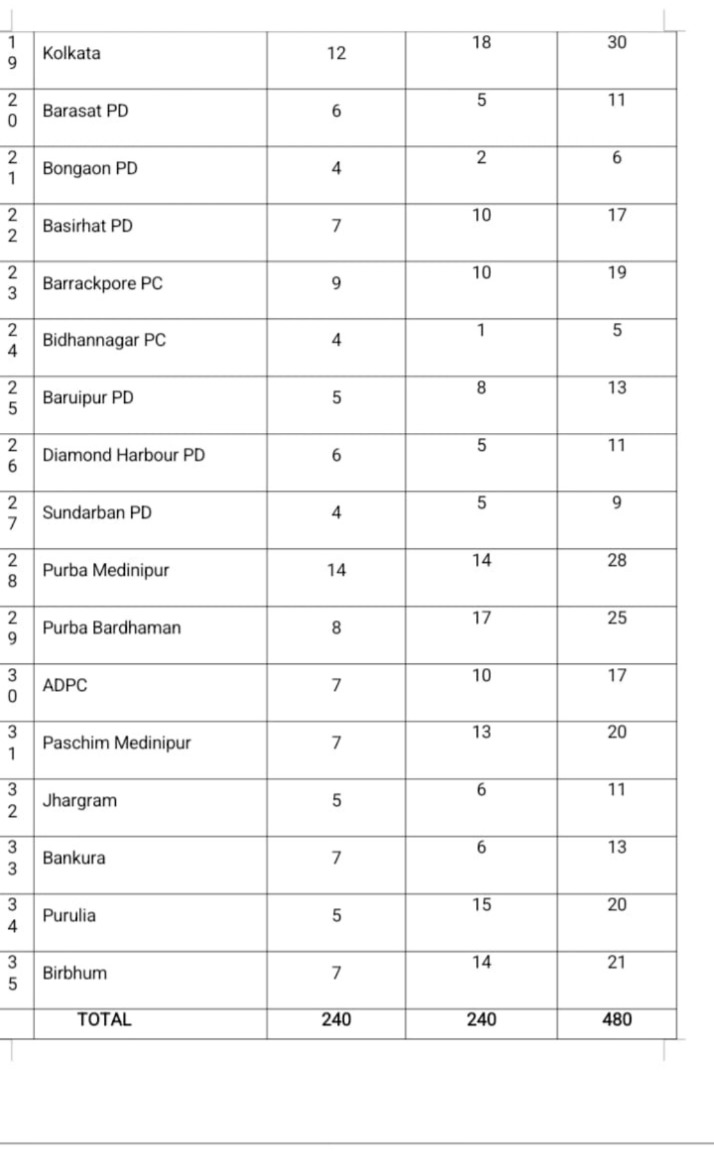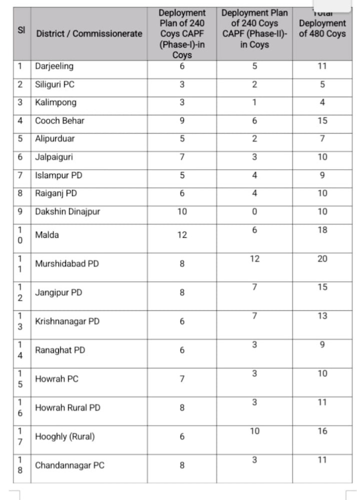 এছাড়াও, পশ্চিম মেদিনীপুর, পুরুলিয়া, মুর্শিদাবাদ পুলিশ জেলায় ২০, ব্যারাকপুর পুলিশ কমিশনারেট এলাকায় ১৯, মালদহে ১৮, জঙ্গিপুর পুলিশ জেলায় ১৫, হাওড়া পুলিশ কমিশনারেট এলাকায় ১০ কোম্পানি মোতায়েন করা হচ্ছে।