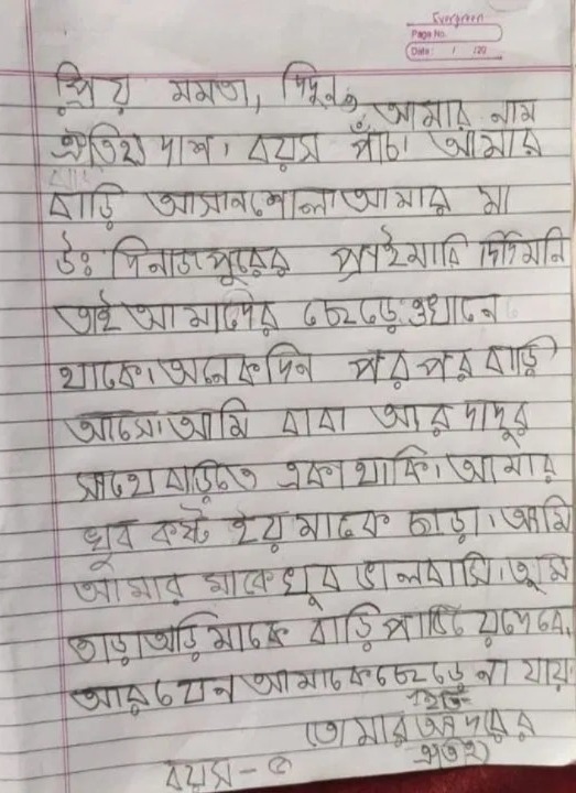 মাকে মাসের পর মাস না দেখে খুদে মনে জমেছে অভিমান। তাই একদিন খাতার পাতায় পেন্সিল দিয়ে লিখে ফেলল, আমার খুব কষ্ট হয় মাকে ছাড়া। আমি মাকে খুব ভালবাসি। মাকে যদি তাড়াতাড়ি বাড়ি পাঠাও, তবে আমি আবার তোমাকে ধন্যবাদ জানিয়ে চিঠি লিখব।”