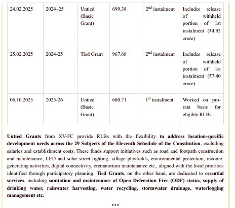 কেন্দ্রীয় পঞ্চায়েতি রাজ মন্ত্রক জানিয়েছে, এই অনুদানের লক্ষ্য হল গ্রামীণ স্তরে উন্নয়ন ও স্বশাসনকে আরও শক্তিশালী করা, যাতে পঞ্চায়েত প্রতিষ্ঠানগুলি নিজস্ব চাহিদা অনুযায়ী প্রকল্প হাতে নিতে পারে এবং জনজীবনে সরাসরি প্রভাব ফেলতে পারে।