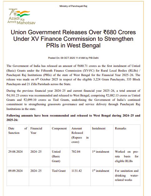 পঞ্চদশ অর্থ কমিশনের (Union Government) অধীনে ‘সংযুক্ত (মৌলিক) অনুদান’ খাতে চলতি অর্থবর্ষে ৬৮০ কোটি ৭১ লক্ষ টাকা বরাদ্দ করেছে কেন্দ্রীয় সরকার (Central Government)।