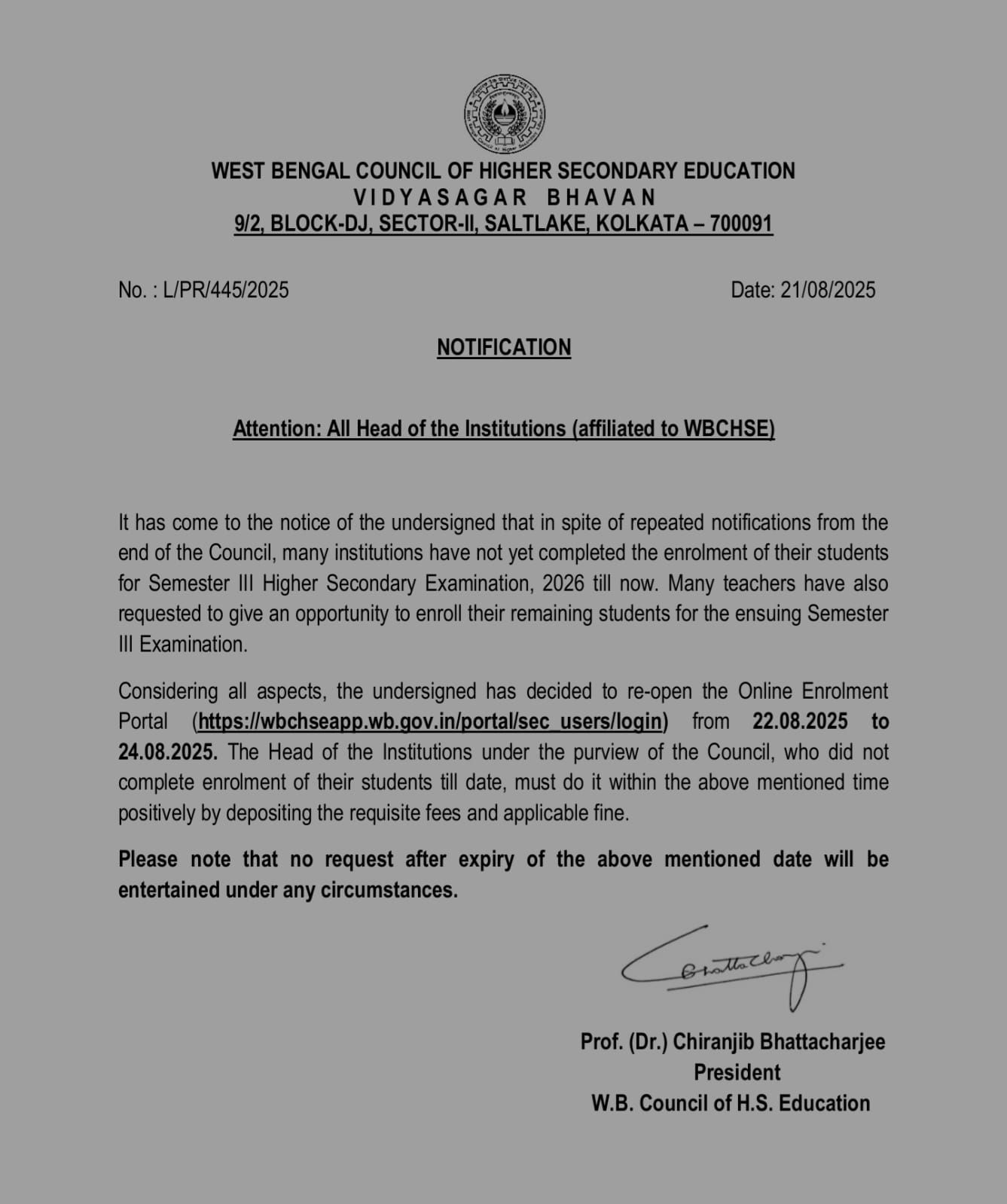 পশ্চিমবঙ্গ উচ্চমাধ্যমিক শিক্ষা সংসদের (WBCHSE) সভাপতি অধ্যাপক চিরঞ্জীব ভট্টাচার্য এক বিজ্ঞপ্তিতে জানিয়েছেন, ২২ অগস্ট থেকে ২৪ অগস্ট পর্যন্ত অনলাইনে ভর্তির সুযোগ দেওয়া হবে। নির্দিষ্ট সময়ের মধ্যে স্কুলগুলিকে বকেয়া ভর্তি প্রক্রিয়া শেষ করতে হবে। এর জন্য প্রয়োজনীয় ফি ও জরিমানাও জমা করতে হবে।