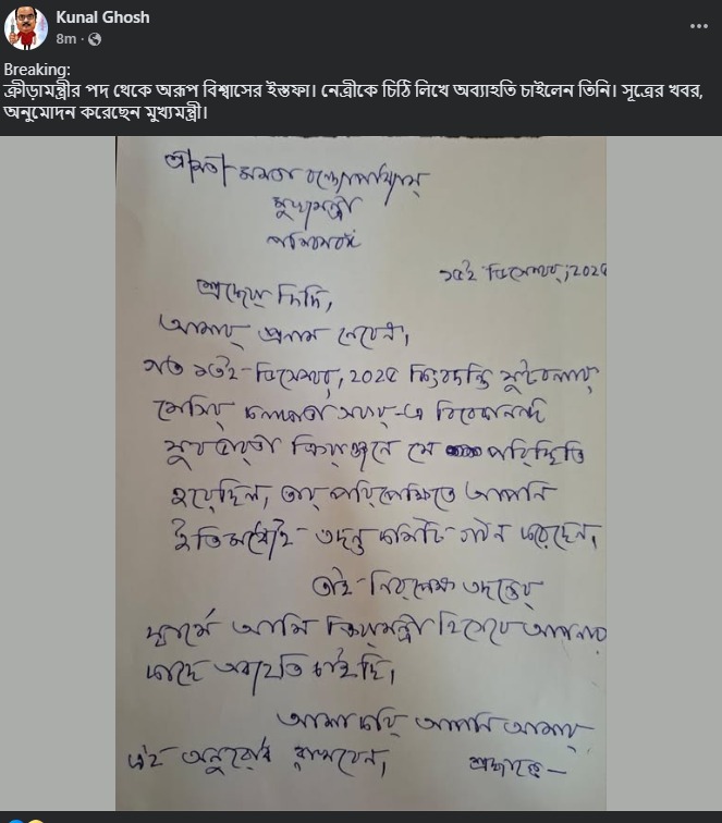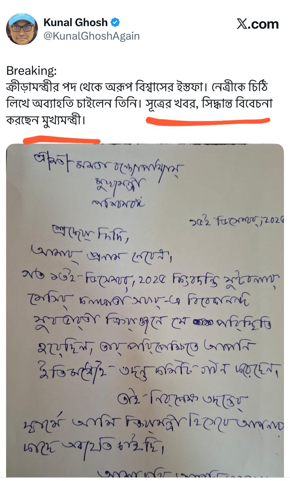 মুখ্যমন্ত্রীকে দেওয়া চিঠিতে অরূপ লিখেছেন, ‘আশাকরি আপনি আমার অনুরোধ রাখবেন’। আবার অরূপের চিঠি সোশাল মিডিয়ায় পোস্ট করে কুণাল ঘোষ প্রথমে দাবি করেছিলেন, অরূপের অনুরোধ দিদি রেখেছেন এবং ইস্তফা গ্রহণও করে নিয়েছেন। যদিও পরে তিনি সেই পোস্ট এডিট করে লিখেছেন, "সূত্রের খবর সিদ্ধান্ত বিবেচনা করছেন মুখ্যমন্ত্রী।"