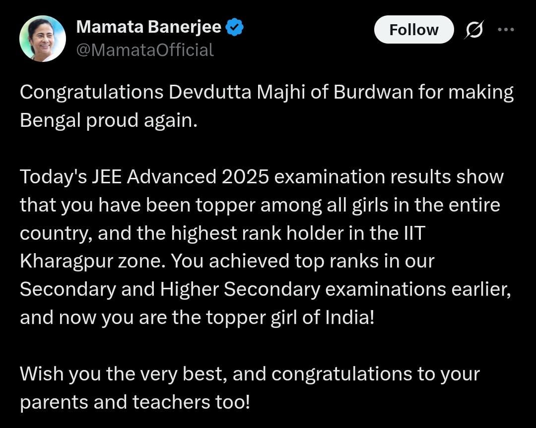 দ্য ওয়াল ব্যুরো: সোমবার জেইই অ্যাডভান্সড ২০২৫-এর ফলাফল প্রকাশ হয়েছে। আর এই পরীক্ষায় আইআইটি খড়্গপুর জোন থেকে প্রথম এবং সর্বভারতীয় স্তরে মহিলাদের মধ্যে প্রথম হয়েছেন দেবদত্তা মাঝি। তাঁকে শুভেচ্ছা জানিয়ে সোশ্যাল মিডিয়ায় পোস্ট করেছেন বাংলার মুখ্যমন্ত্রী মমতা বন্দ্যোপাধ্যায়। তিনি বলেছেন, বর্ধমানের মেয়ে গোটা বাংলা এবং দেশের গর্ব।