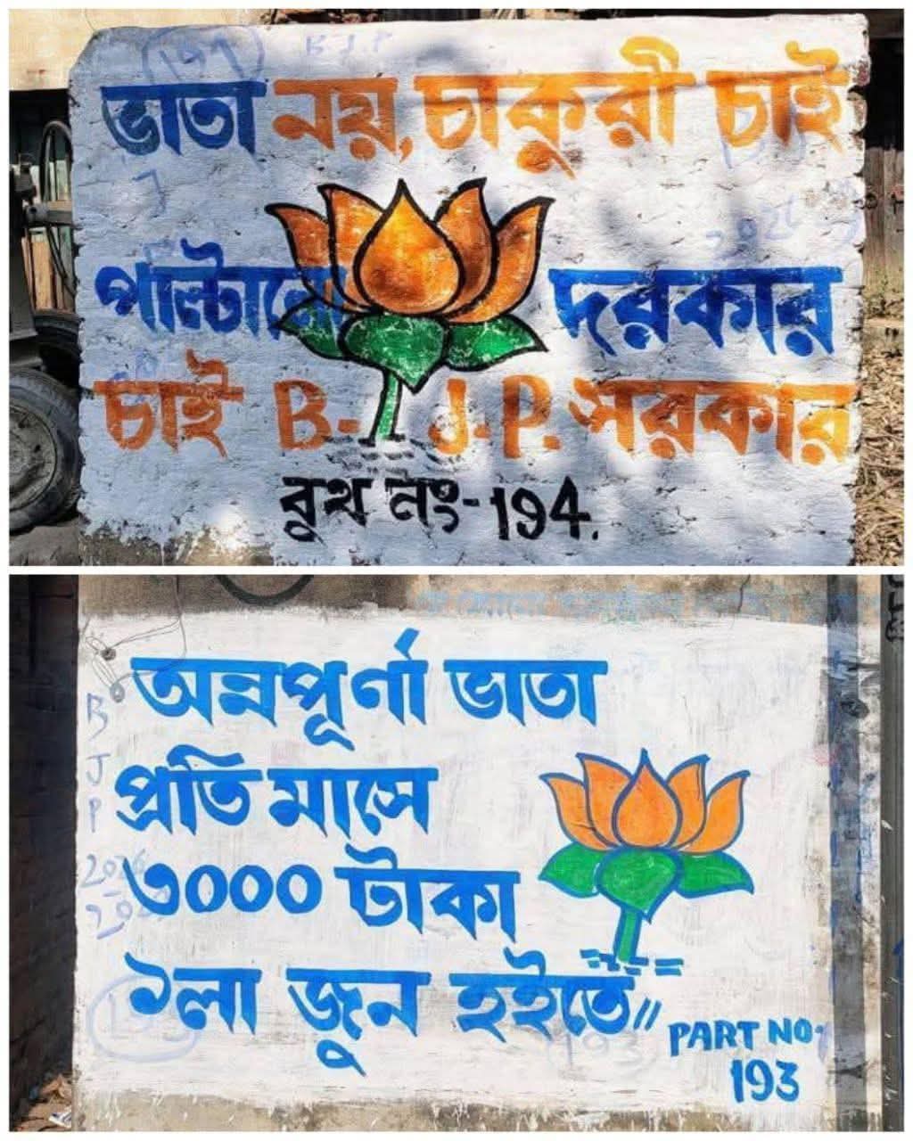 পূর্ব বর্ধমানের ভাতারের ১৯৩ নম্বর পার্টের দেওয়ালে বড় বড় করে লেখা হয়েছে, ‘অন্নপূর্ণা ভাণ্ডার প্রতি মাসে ৩ হাজার টাকা। ১ জুন হইতে।’ স্থানীয় বিজেপি নেতৃত্বের দাবি, এটা তাঁদের দলের ঘোষিত নীতি। ক্ষমতায় এলে লক্ষ্মীর ভাণ্ডারের ভোলবদল করে হবে ‘অন্নপূর্ণা’, আর অর্থের পরিমাণ বাড়িয়ে করা হবে ৩ হাজার। অথচ ঠিক তার পাশের ১৯৪ নম্বর বুথের দেওয়ালে সেই বিজেপিই লিখছে, ‘ভাতা নয়, চাকুরী চাই। পাল্টানো দরকার, চাই বিজেপি সরকার।’