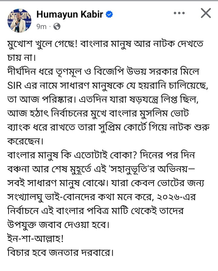 হুমায়ুন আরও লেখেন, বাংলার মানুষ কি এতটাই বোকার? দিনের পর দিন বঞ্চনা, আর শেষ মুহূর্তে সহানুভূতির অভিনয়—সবই সাধারণ মানুষ বুঝে গিয়েছে। সংখ্যালঘু ভাই-বোনদের ভোটের জন্যই তাঁদের কথা মনে করা হচ্ছে বলেও অভিযোগ তোলেন তিনি। তাঁর দাবি, ২০২৬-এর বিধানসভা নির্বাচনে বাংলার পবিত্র মাটি থেকেই এই রাজনীতির উপযুক্ত জবাব দেওয়া হবে। পোস্টের শেষে তিনি লেখেন, “বিচার হবে জনতার দরবারে।”
