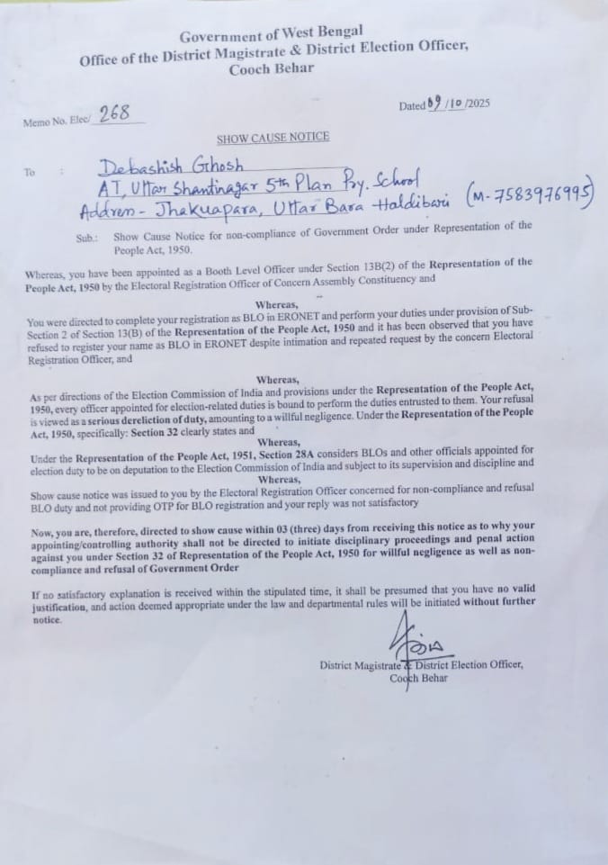 সূত্রের খবর, প্রয়োজনীয় নিরাপত্তার আশ্বাস দেওয়ার পরও শতাধিক বিএলও কাজে আগ্রহ না দেখানোয় এবং দায়িত্ব পালনে অনীহা প্রকাশ করায় তাঁদের শোকজ নোটিস ধরানো হয়েছে। কমিশনের তরফে জানানো হয়েছে, ব্যাখ্যায় সন্তুষ্ট না হলে পদক্ষেপও করা হতে পারে।