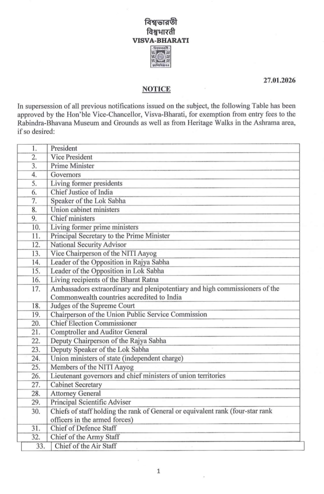 বিশ্বভারতীর কর্মসচিব বিকাশ মুখোপাধ্যায়ের জারি করা বিজ্ঞপ্তিতে বলা হয়েছে, মোট ১০৬ জন পদাধিকারী রবীন্দ্রভবন সংগ্রহশালা ও বিশ্বভারতী ক্যাম্পাসে বিনা টিকিটে প্রবেশ করতে পারবেন। তালিকায় রয়েছেন ভারতের রাষ্ট্রপতি, উপ-রাষ্ট্রপতি, প্রধানমন্ত্রী, সুপ্রিম কোর্টের প্রধান বিচারপতি, কেন্দ্রীয় শিক্ষামন্ত্রী, রাজ্যপাল, মুখ্যমন্ত্রী-সহ একাধিক ভিভিআইপি। উপাচার্য প্রবীরকুমার ঘোষের অনুমতিক্রমেই এই বিজ্ঞপ্তি জারি হয়েছে বলে জানা গিয়েছে।