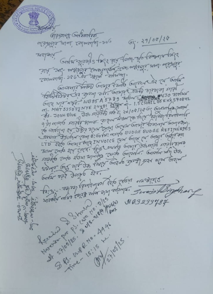 গত ২৭ মে নরেন্দ্রপুর থেকে বজবজ আসার পথে একটি বেসরকারি সংস্থার মালবোঝাই গাড়ি উধাও হয়ে গিয়েছে। তারপর থেকে বেপাত্তা চালক।