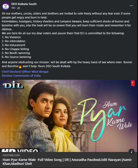 দক্ষিণ কলকাতার জেলা নির্বাচনী আধিকারিকের (DEO) পেজ থেকে করা সেই পোস্টে একদিকে যেমন ভোটারদের অভয় দেওয়া হয়েছে, তেমনই অপরাধীদের উদ্দেশে ধেয়ে গিয়েছে কড়া বার্তা। আর সেই বার্তায় ‘বার্নল’ ও ‘বোরোলিন’-এর অনুষঙ্গ টেনেই শুরু হয়েছে ব্যাপক চর্চা।
