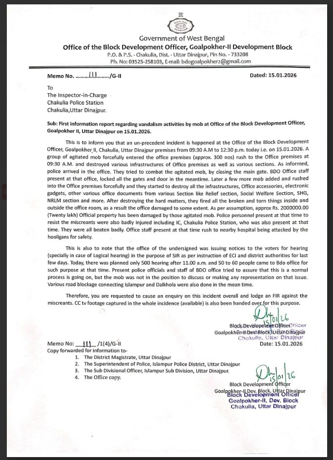 বিডিও অভিযোগপত্রে জানিয়েছেন, সকাল সাড়ে ৯টা থেকে শুরু হয়ে দুপুর সাড়ে ১২টা পর্যন্ত চলে ওই তাণ্ডব। অভিযোগ, সেখানে ‘লজিক্যাল হিয়ারিং’ হওয়ার কথা ছিল। ভোটার তালিকা সংক্রান্ত শুনানি নিয়ে ক্ষোভ বাড়ছিল স্থানীয়দের মধ্যে। শুনানি যখন শুরু হওয়ার কথা ছিল, সেই সময় পেরিয়ে যাওয়ায় জমায়েত উত্তেজিত হয়ে ওঠে।