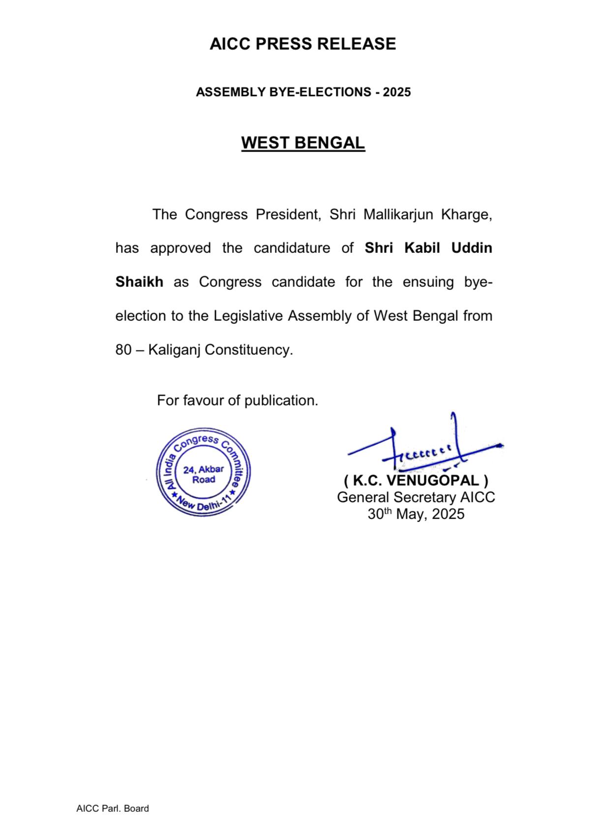 গত বিধানসভা নির্বাচনে কালীগঞ্জে বিপুল ভোটে বিজেপি প্রার্থীকে হারিয়েছিলেন তৃণমূলের নাসিরউদ্দিন। প্রায় ৫২ শতাংশ ভোট পেয়েছিলেন তিনি। বিজেপি প্রার্থী পেয়েছিলেন ৩০ শতাংশ ভোট। নাসিরউদ্দিনের প্রয়াণেই এখানে উপ নির্বাচন হচ্ছে। শাসকদল প্রয়াত বিধায়কের কন্য়া আলিফা আহমেদকে প্রার্থী করেছে। এবার কংগ্রেসের তরফে কাবিলউদ্দিন শেখের নাম ঘোষণা করা হল। শুক্রবার রাতে কংগ্রেস সভাপতি মল্লিকার্জুন খাড়্গে এক প্রেস বিবৃতিতে প্রার্থীর নাম ঘোষণা করেছেন।