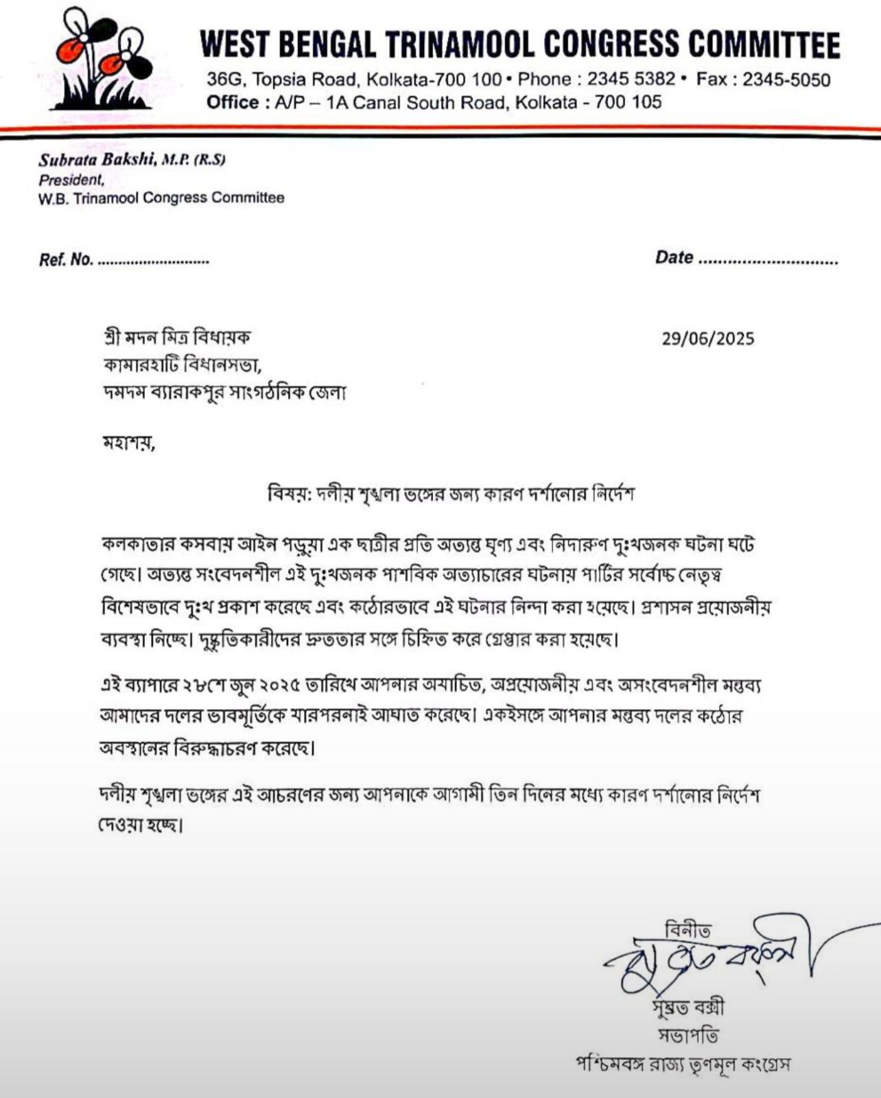 এই শোকজ পর্বে স্পষ্ট, ঘটনাটিকে কেন্দ্র করে শাসকদলের অন্দরেই ক্রমে বাড়ছে অস্বস্তি ও চাপ। এখন দেখার, মদন মিত্র দলের কাছে কী ব্যাখ্যা দেন এবং মদনের মতো কল্যাণ বন্দ্যোপাধ্যায়কেও চিঠি ধরানো হয় কিনা।