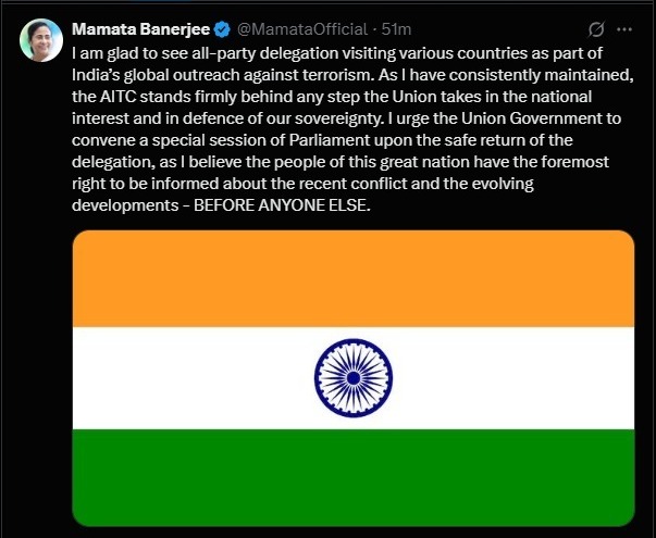 মমতার বক্তব্য, ''ভারতের বিরুদ্ধে সন্ত্রাসবাদী কার্যকলাপ নিয়ে গোটা বিশ্ব ঘুরে ঘুরে এই প্রতিনিধি দল জানাচ্ছে। এই উদ্যোগে আমি খুশি। তবে সাম্প্রতিক পরিস্থিতি এবং সেই সংক্রান্ত যাবতীয় খবরাখবর সবার আগে দেশবাসীর জানা উচিত। তাই চাইছি, সর্বদলের প্রতিনিধিরা বিদেশ ভ্রমণ সেরে ফিরে আসার পর সংসদে বিশেষ অধিবেশন ডাকা হোক।'' বাংলার মুখ্যমন্ত্রী এও মনে করিয়ে দেন, দেশের সুরক্ষা ও সার্বভৌমত্ব রক্ষায় কেন্দ্র যে সিদ্ধান্ত নেবে তা সমর্থন করবে তৃণমূল কংগ্রেস সরকার।