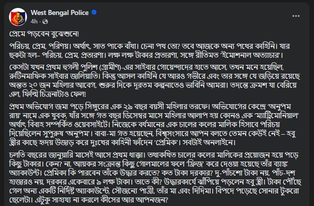 শেষে পুলিশের সোশ্যাল পোস্টের কথাতেই ফিরে যাওয়া যাক, “প্রেমে পড়বেন, কিন্তু বুঝেশুনে! কারণ অনলাইনের ওপারে কে আছে, তা সবসময় চোখে দেখা যায় না যে!”