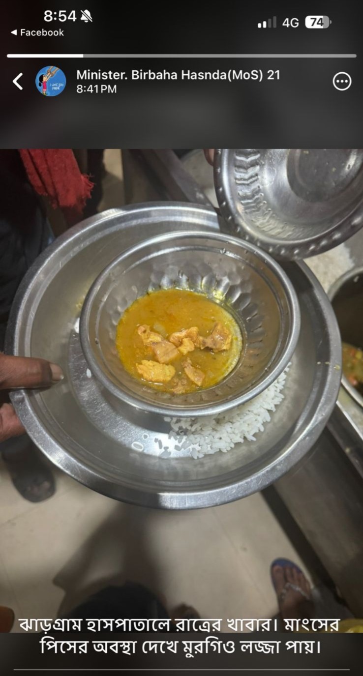 শুক্রবার নিজের হোয়াটসঅ্যাপ স্ট্যাটাসে (WhatsApp status) সরকারি হাসপাতালের রোগীদের দেওয়া খাবারের ছবি পোস্ট করেন। তাতে দেখা যাচ্ছে, একটি বড় বাটির মধ্যে ছোট য়েক টুকরো মাংস। ছবির ক্যাপশনে তিনি লেখেন, “ঝাড়গ্রাম হাসপাতালে রাতের খাবার! মাংসের পিসের অবস্থা দেখে মুরগিও লজ্জা পায়!”