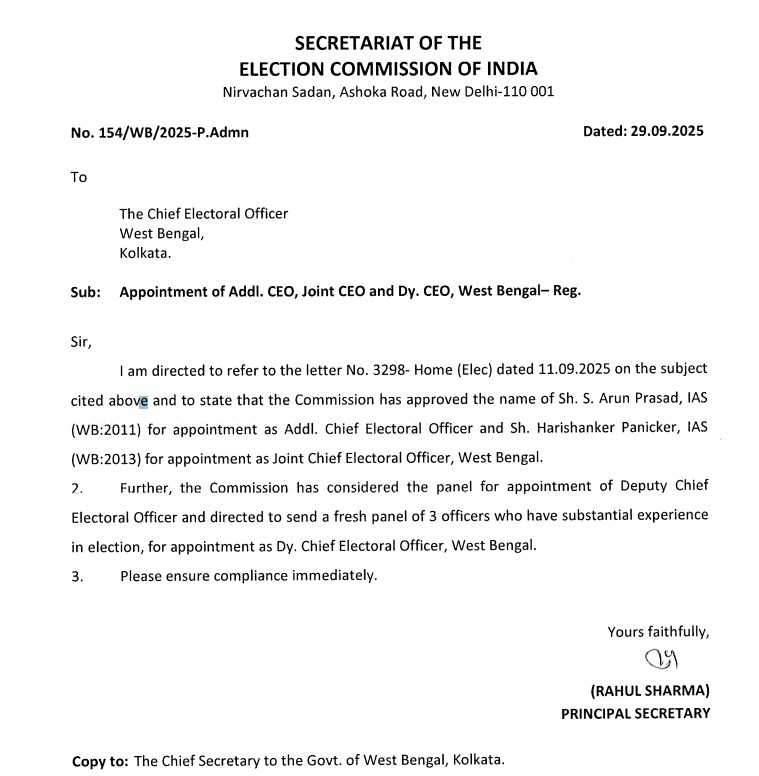 কমিশনের নির্দেশ অনুযায়ী, আইএএস অফিসার শ্রী এস. অরুণ প্রসাদ (WB:2011) হচ্ছেন নতুন অ্যাডিশনাল সিইও এবং আইএএস অফিসার হরিশঙ্কর পানিক্কর (WB:2013) হচ্ছেন নতুন জয়েন্ট সিইও।