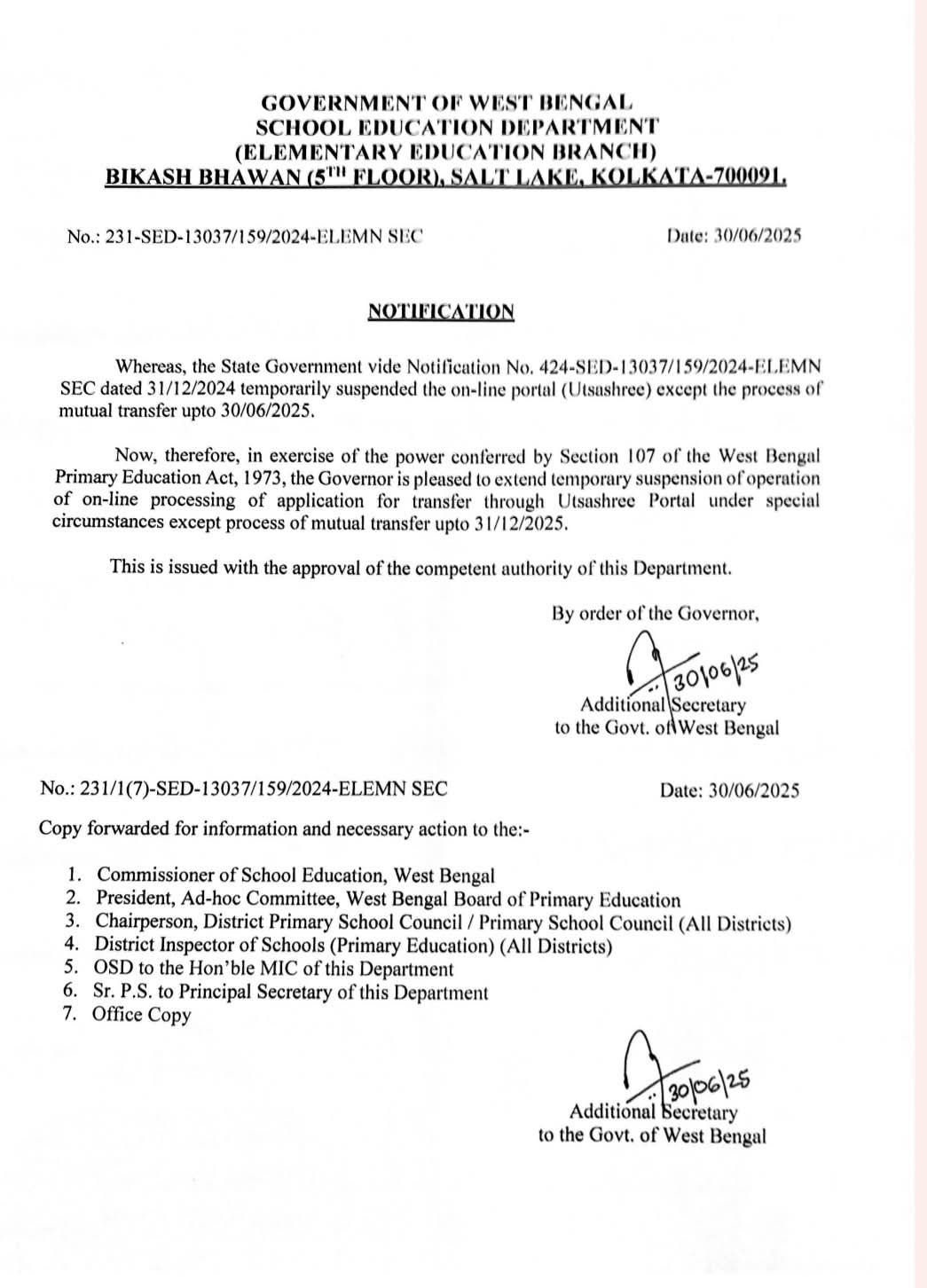 শুক্রবার, ৩০ জুন জারি হওয়া শিক্ষা দফতরের বিজ্ঞপ্তিতে জানানো হয়েছে, বিশেষ প্রশাসনিক পরিস্থিতি ও আইনি পরামর্শের ভিত্তিতে উৎসশ্রী পোর্টালের অনলাইন বদলির প্রক্রিয়া স্থগিত রাখা হচ্ছে ৩১ ডিসেম্বর ২০২৫ পর্যন্ত।
