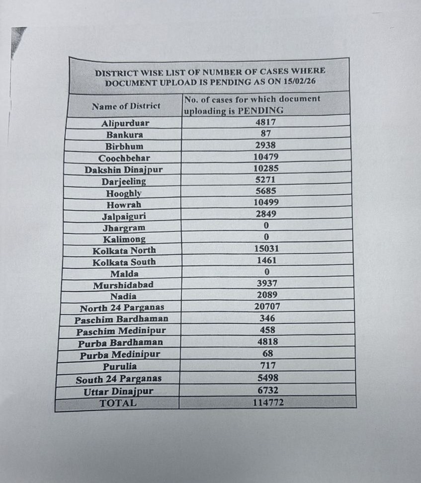 দ্য ওয়াল ব্যুরো: পশ্চিমবঙ্গের বিধানসভা ভোটের (West Bengal Elections 2026) আগে রাজ্যের এসআইআর (West Bengal SIR) প্রক্রিয়ার শুনানি পর্ব শেষ হতেই নতুন করে জটিলতা সামনে এসেছে। বিপুল সংখ্যক ভোটারের নথি এখনও অনলাইনে তোলা হয়নি (SIR Documents Upload) - এমনই অভিযোগ তুলেছেন মুখ্যমন্ত্রী মমতা বন্দ্যোপাধ্যায় (Mamata Banerjee)। সকালেই যে তথ্য দিয়েছিল দ্য ওয়াল (The Wall News)। এ নিয়ে রাজনৈতিক চাপানউতোরের মধ্যেই সামনে এসেছে জেলাভিত্তিক পরিসংখ্যান।