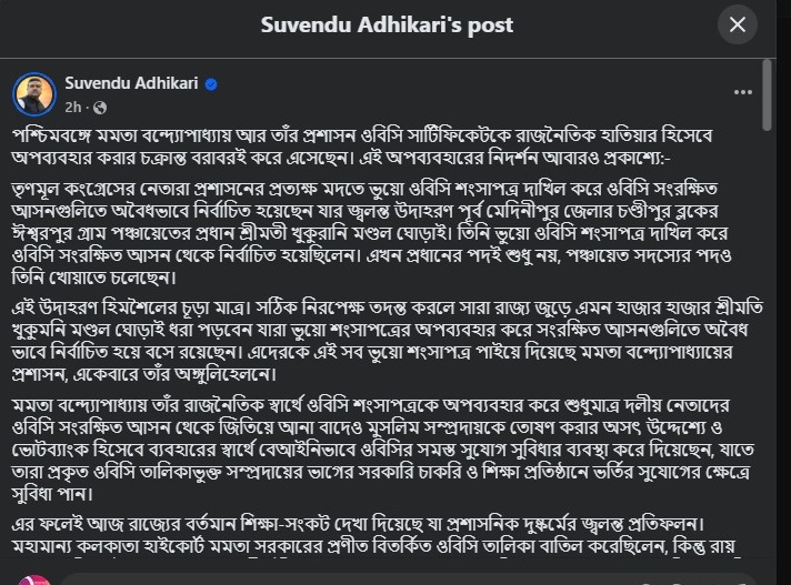 শুভেন্দুর দাবি, রাজনৈতিক সুবিধা পাইয়ে দেওয়া এবং মুসলিম সম্প্রদায়কে খুশি করার জন্যই মমতা সরকারের আমলে বিপুল সংখ্যায় বেআইনি ওবিসি শংসাপত্র বিলি হয়েছে। এর ফলে প্রকৃত ওবিসি সম্প্রদায়ের মানুষ সংরক্ষণের সুযোগ থেকে বঞ্চিত হচ্ছেন।
