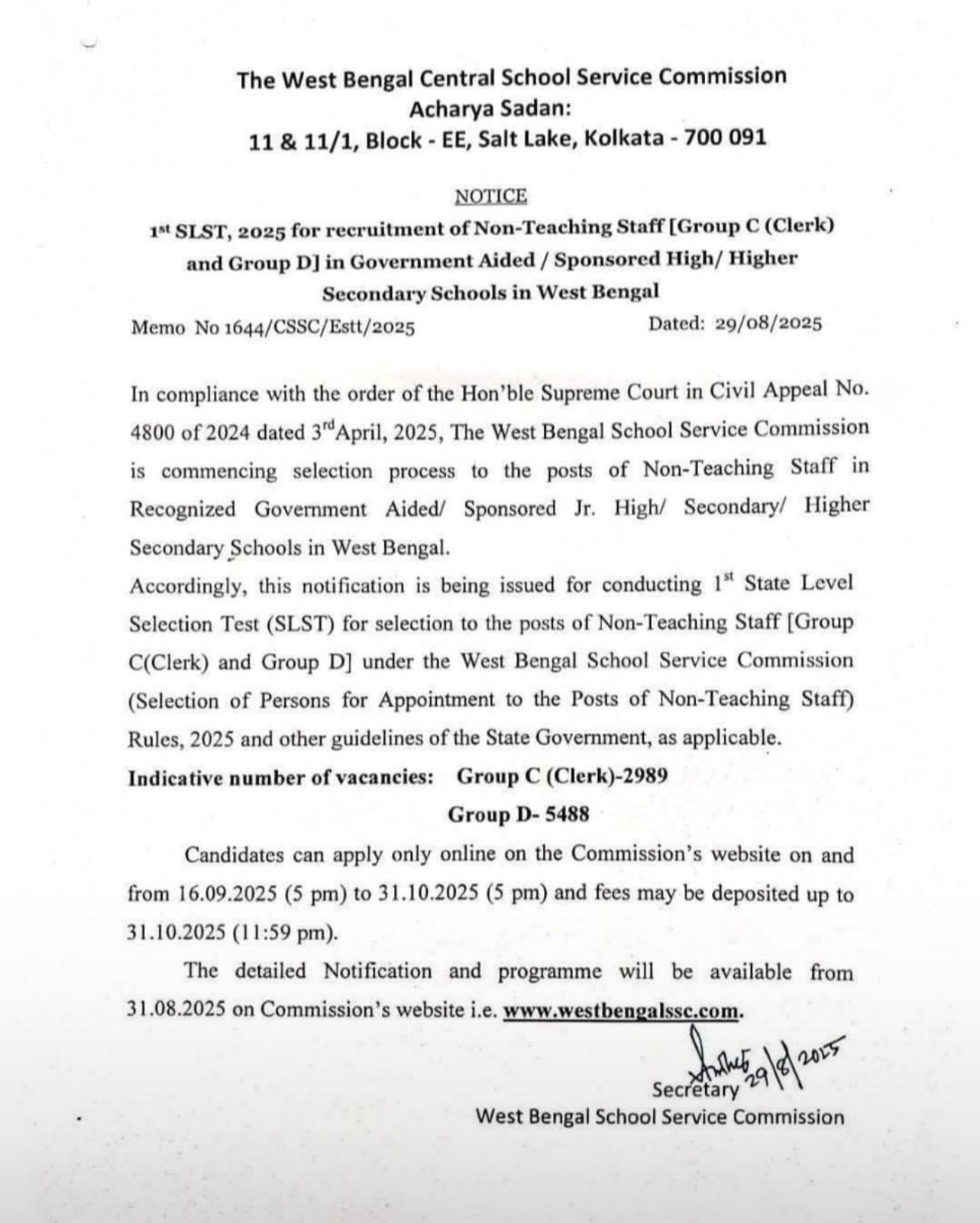 সুপ্রিম কোর্টের (Supreme Court) নির্দেশ মেনেই এই নিয়োগ প্রক্রিয়া শুরু হচ্ছে। কমিশনের বিজ্ঞপ্তি অনুযায়ী, প্রথম রাজ্যস্তরের সিলেকশন টেস্ট (SLST)-এর মাধ্যমে নিয়োগ হবে গ্রুপ সি (ক্লার্ক) ও গ্রুপ ডি পদে।