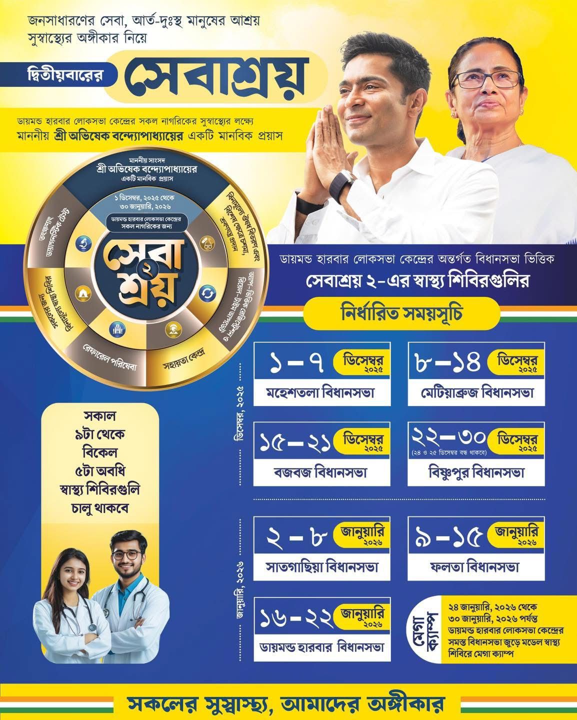 সোশ্যাল মাধ্যমে সেবাশ্রয়-২ এর সময়সূচিও ঘোষণা করেছেন অভিষেক। ১ ডিসেম্বর, ২০২৫ থেকে শুরু হয়ে চলবে ২২ জানুয়ারি, ২০২৬ পর্যন্ত। এরপর ২৪ জানুয়ারি থেকে ৩০ জানুয়ারি, ২০২৬ পর্যন্ত ডায়মন্ড হারবার লোকসভা কেন্দ্রের সমস্ত বিধানসভা জুড়ে অনুষ্ঠিত হবে মেগা ক্যাম্প। প্রতিটি শিবির চলবে সকাল ৯টা থেকে বিকেল ৫টা পর্যন্ত।