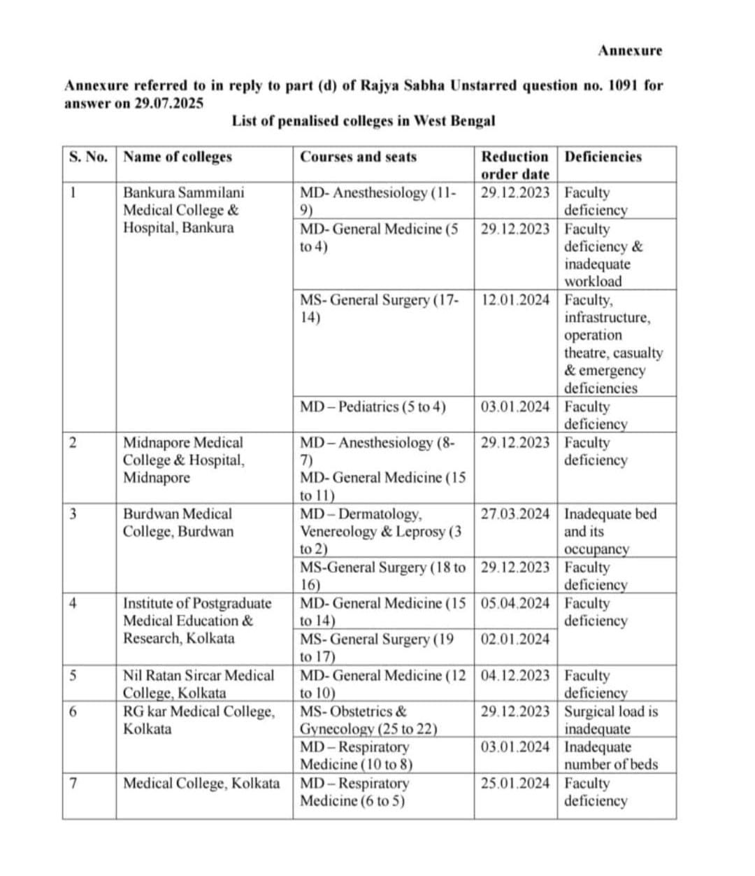 বাঁকুড়া সম্মিলনী মেডিক্যাল কলেজে অ্যানাস্থেশিয়ায় ২টি, জেনারেল মেডিসিনে ১টি, সার্জারিতে ৩টি ও শিশুরোগে ১টি আসন কমেছে। মেদিনীপুর মেডিক্যাল কলেজে অ্যানাস্থেশিয়ায় ১টি ও মেডিসিনে ৪টি। বর্ধমান মেডিক্যাল কলেজে চর্মরোগে ১টি ও সার্জারিতে ২টি আসন কমেছে। পিজি হাসপাতালে জেনারেল মেডিসিনে ১টি ও সার্জারিতে ২টি। এনআরএস-এ মেডিসিনে ২টি আসন কমেছে। আরজি কর মেডিক্যাল কলেজে স্ত্রীরোগ ও প্রসূতিতত্ত্বে ৩টি এবং রেসপিরেটরি মেডিসিনে ২টি। কলকাতা মেডিক্যাল কলেজে রেসপিরেটরি মেডিসিনে ১টি আসন কমেছে।