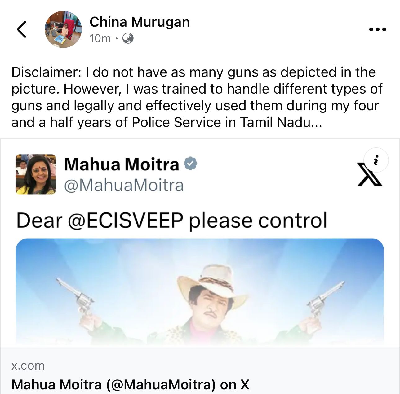এর পাল্টা জবাব দিয়েছেন মুরুগান নিজেই। সোশ্যাল মিডিয়ায় তিনি লেখেন, পোস্টারের মতো তাঁর কাছে এত বন্দুক নেই। পাশাপাশি জানান, আইনত তিনি আগ্নেয়াস্ত্র চালানোর প্রশিক্ষণপ্রাপ্ত এবং তামিলনাড়ু পুলিশে চার বছর কর্মরত থাকার সময়ে সেগুলি ব্যবহারও করেছেন।