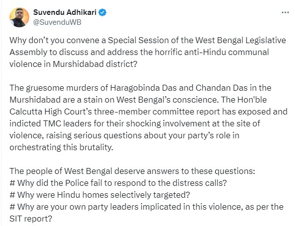রাজ্যের বিরোধী দলনেতার বক্তব্য, এমন কিছু প্রশ্ন রয়েছে যার উত্তর রাজ্যের মানুষও চায়। তাই মুর্শিদাবাদ নিয়ে বিশেষ অধিবেশনের প্রয়োজন রয়েছে। কী সেই প্রশ্ন? শুভেন্দু এক্স হ্যান্ডেলে পোস্ট করে লেখেন, ''রাজ্যের মানুষ এই প্রশ্নগুলির উত্তর চায় - কেন অভিযোগ পাওয়ার পরও পুলিশ ব্যর্থ হল? কেন শুধুমাত্র হিন্দুদের বাড়িকে নিশানা করা হল? কেন তৃণমূলের দলের লোকেরা এই পরিস্থিতি তৈরি করল?'' প্রসঙ্গত কলকাতা হাইকোর্ট গঠিত তিন সদস্যের ফ্যাক্ট ফাইন্ডিং কমিটি জানিয়েছে, তৃণমূলের নেতারা হামলার পিছনে উস্কানি দিয়েছিলেন।