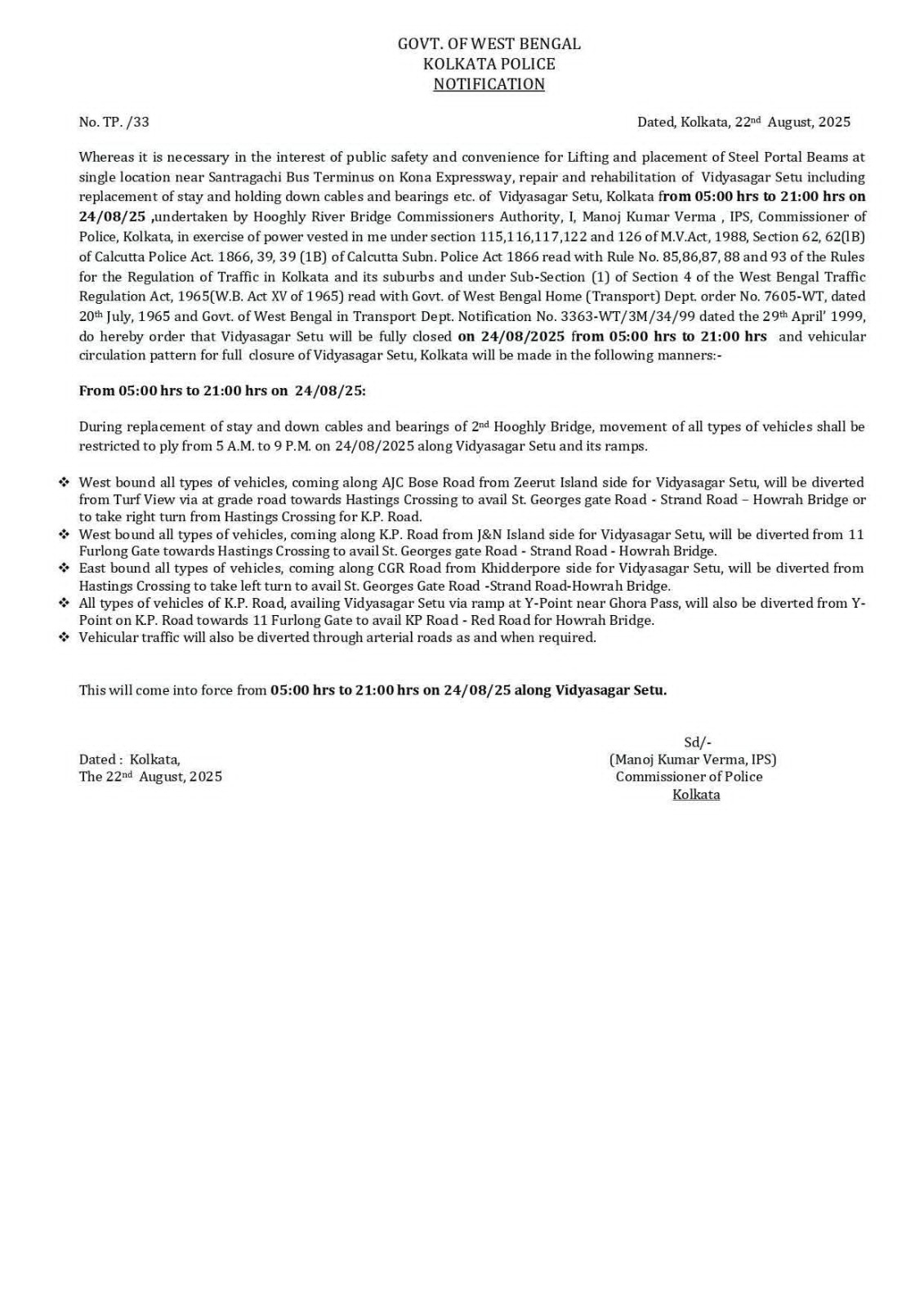 সিজিআর রোড ব্যবহারকারীদের জন্যও হেস্টিংস ক্রসিং হয়ে স্ট্র্যান্ড রোড – হাওড়া ব্রিজ ব্যবহার করার নির্দেশ দেওয়া হয়েছে। এছাড়া কেপি রোড ব্যবহারকারীরা, যাদের সেতু দিয়ে যাওয়া প্রয়োজন, তারা বিকল্প রুট হিসেবে ১১ ফার্লং গেট হয়ে কেপি রোড – রেড রোড – হাওড়া ব্রিজ ব্যবহার করতে পারবেন। প্রয়োজনে পুলিশ অন্যান্য আর্টিরিয়াল রোডের মাধ্যমে যানবাহন ডাইভারশন করার সিদ্ধান্ত নিয়েছে।