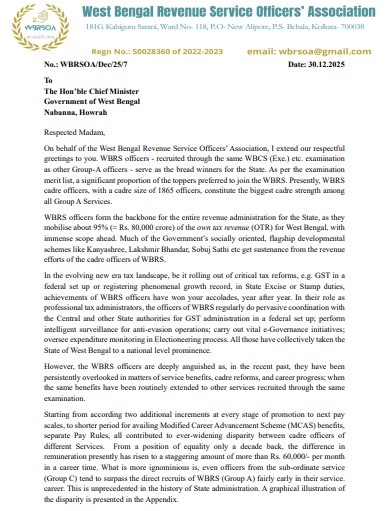 স্মারকলিপিতে জানানো হয়েছে, WBRS অফিসাররা একই WBCS (Exe.) পরীক্ষার মাধ্যমে নিয়োগপ্রাপ্ত অন্যান্য গ্রুপ–এ পরিষেবার সমতুল্য হয়েও বাস্তবে সমান সুযোগ-সুবিধা পাচ্ছেন না।