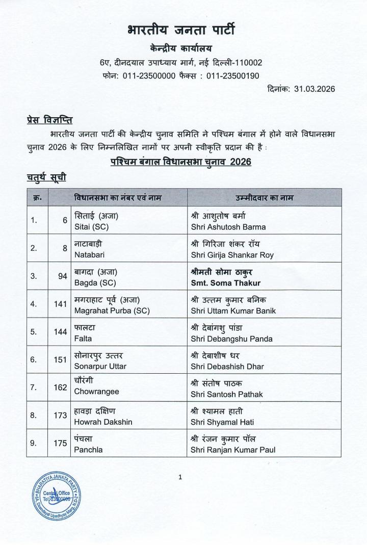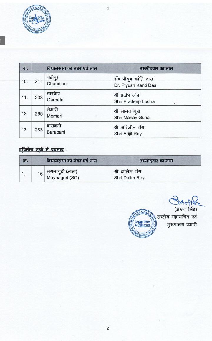 মঙ্গলবার প্রকাশিত হওয়া প্রার্থী তালিকায় উল্লেখযোগ্য নাম চৌরঙ্গীর প্রার্থী সন্তোষ পাঠক এবং বাগদার প্রার্থী সোমা ঠাকুর, যিনি কেন্দ্রীয় মন্ত্রী তথা বনগাঁর বিজেপি সাংসদ শান্তনু ঠাকুরের (Shantanu Thakur) স্ত্রী। এই কেন্দ্রে তাঁর প্রতিদ্বন্দ্বী তৃণমূলের প্রার্থী তথা বিদায়ী বিধায়ক মধুপর্ণা ঠাকুর (Madhuparna Thakur)।